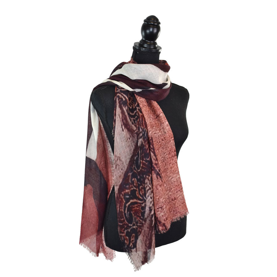 Lightweight yet cozy, this narrow matty wool scarf features a tribal-inspired abstract print that adds bold energy to any fall look. Drape it loosely during crisp days or knot it close on chilly nights—it's the perfect transitional accessory for layering with ease and style. Fabric: 100% Matty Wool Size: 19.5" x 71" Care: Dry Clean Only