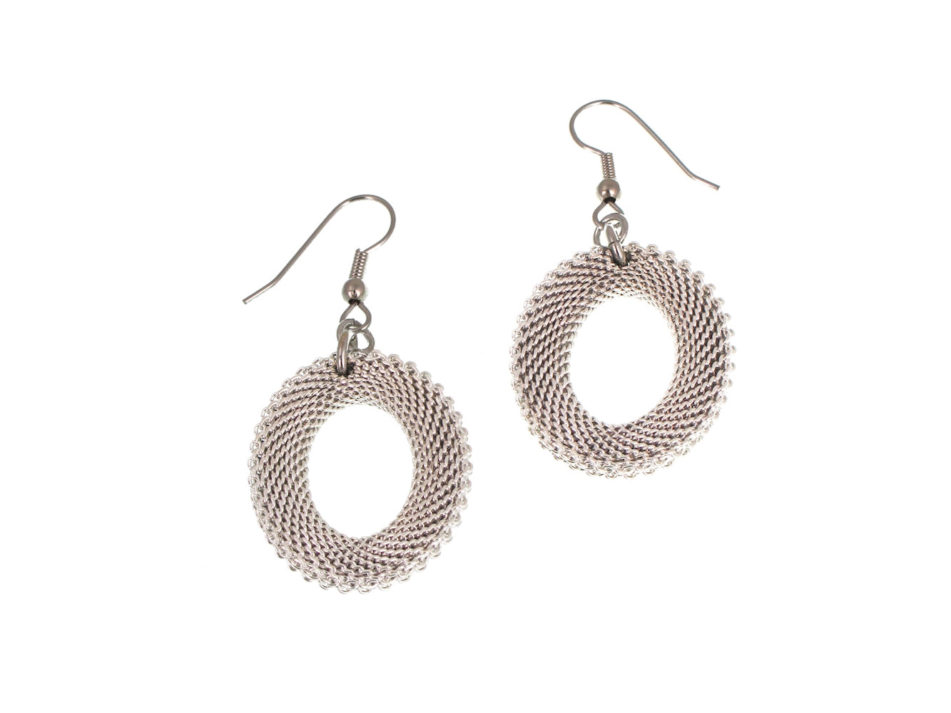 Brass base mesh electroplated with sterling silver. Surgical steel French wires. 2" drop.