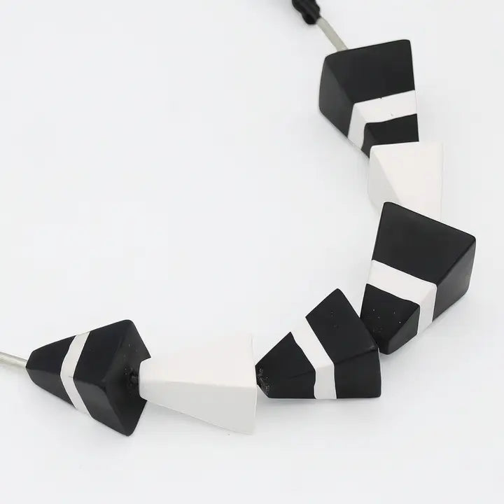 Elevate your accessory collection with the Black Moon Pyramid Statement Necklace. Featuring three-dimensional pyramid beads in striking black and white, this artistic piece showcases exceptional craftsmanship. The adjustable cord ensures a perfect fit, combining bold design with personalized comfort. Ideal for those who appreciate unique, expertly crafted jewelry that makes a lasting impression. Adjustable Length: 22" to 34" Bead Dimensions 1/2" on each side