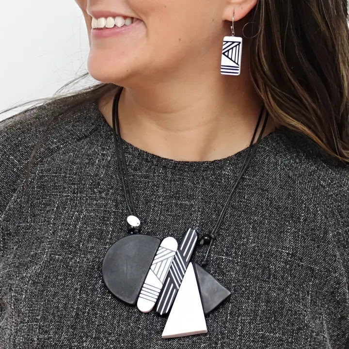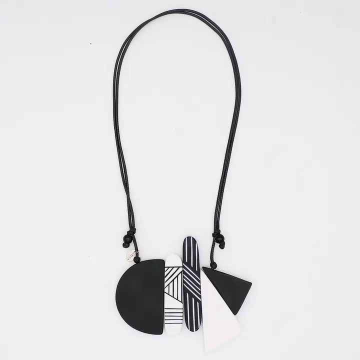 Monochromatic Ameli Pendant Necklace – Unapologetically bold and artfully modern, this striking pendant captures the spirit of abstract design. Featuring a dramatic arrangement of geometric forms with clean lines, unexpected angles, and bold contrasts, this statement piece is crafted to spark curiosity and conversation.