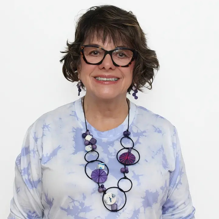 This purple color disk necklace features round metal loops covered with thread and accented with vibrant wood disks and cube beads throughout. Hung on an adjustable black wax cord, you can choose the length you prefer. The perfect color way to go with any outfit; try layering this necklace over a solid color tee or dress and pair with coordinating earrings!