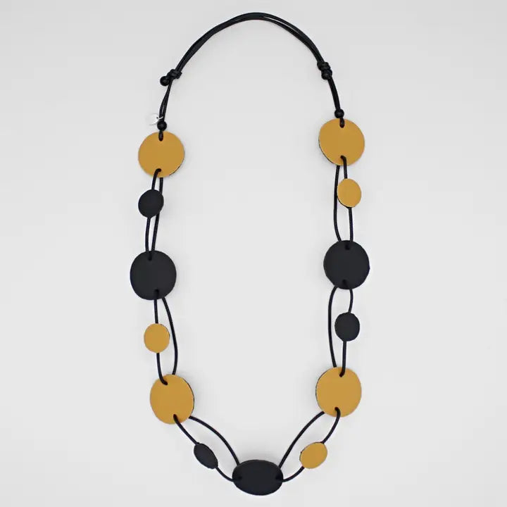 Stand out in this bold necklace! A strand of thin black wax cord is accented with round leather pieces in black and mustard. This color palette allows this necklace to truly go with any outfit. The adjustable cord lets you choose the length you prefer. Wear alone or with coordinating pieces; the options are endless. Adjustable Length: 24”-32” Leather circles: .75"- 1.25”