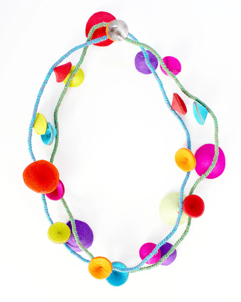 Felted discs that have been fashioned into conical shapes are attached to a felted strand wrapped tightly with thread compose our Douli Necklace.