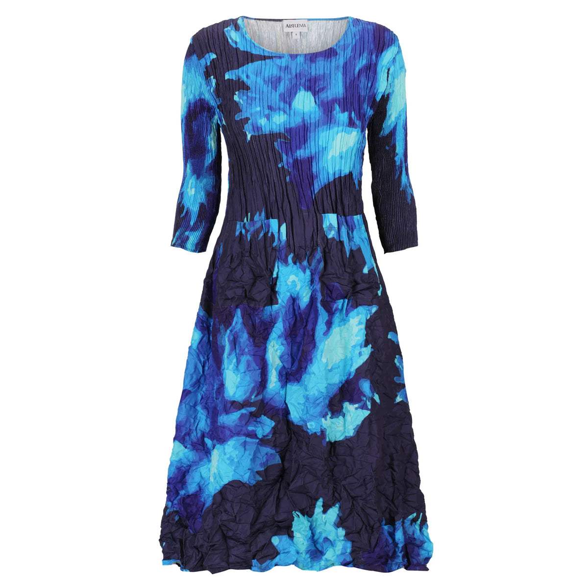 The Smash Pocket Dress is Alquema's best seller. 3/4 quarter sleeves with a richly textured pleating, it has a high round neckline, and a knee grazing length. It finishes with a cinched waist and top entry front pockets. The intricate nature of Shibori pleating lends itself to versatile cuts, fitting all body shapes. Flattering, feminine and easy fitting.