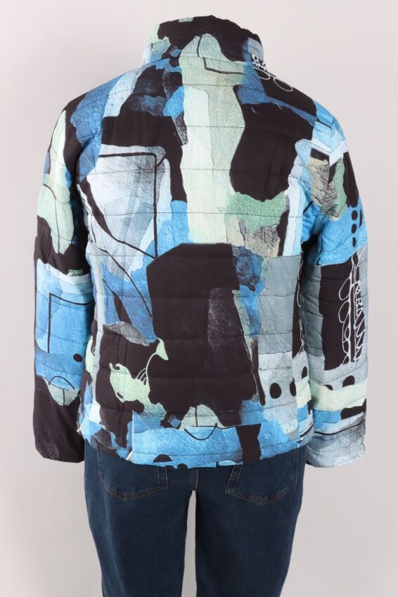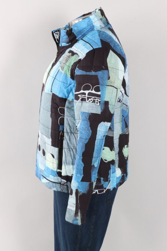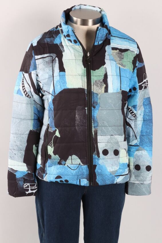 Gorgeously graphic, this lined quilted puffer has a water inspired pattern and cozy warmth when the snowflakes fall. Featuring a shiny pull that accents the zip front, it has a short stand up collar and zip close side pockets.