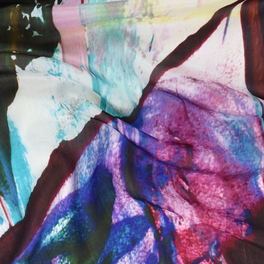 Indulge in this artistic flair of this vibrant silk scarf. Perfect for museum outings or an evening affair, it adds an elegant touch to any ensemble. Adorned with colorful abstract brushstrokes in shades of pink and blue, it's a wearable work of art that captivates the eye. Embrace the fusion of art and fashion with this stunning scarf that's sure to turn heads. Size: 19.5" x 71" Fabric: 100% Silk Care: Dry Clean Only