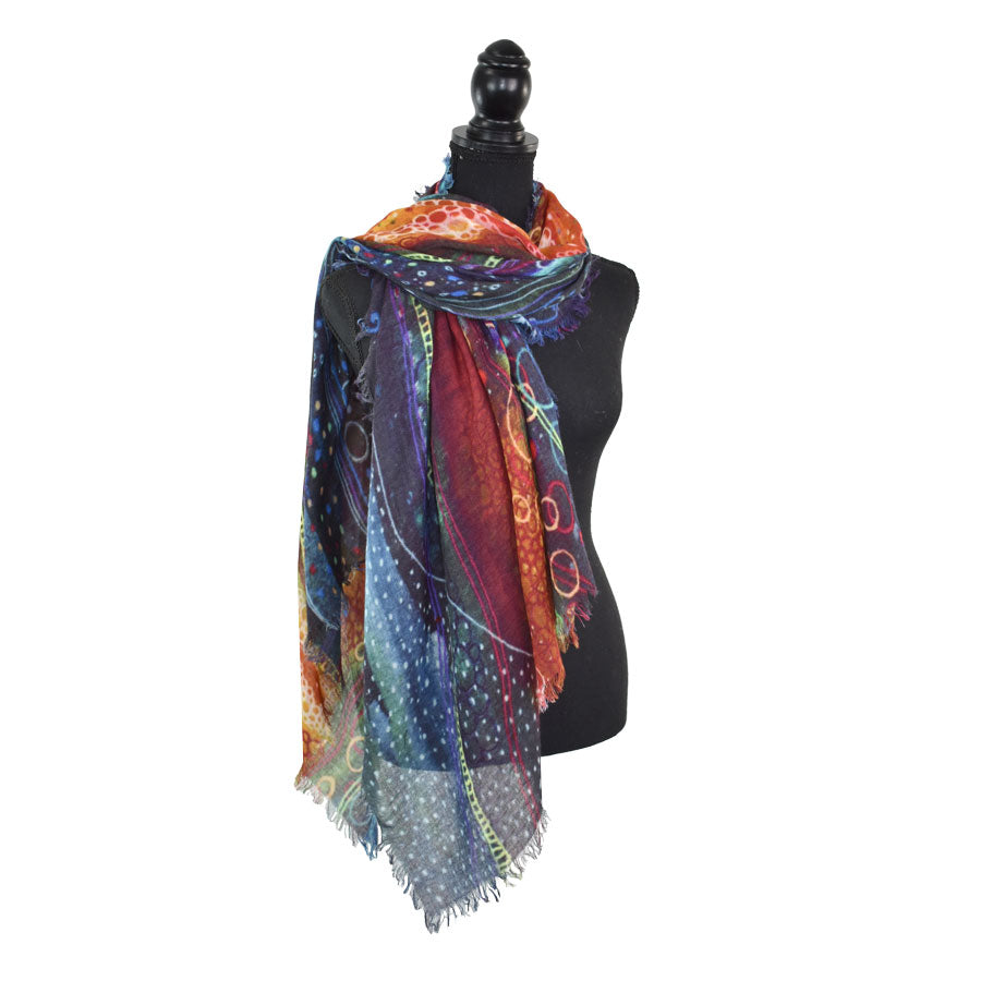 This scarf showcases abstract bubble and watercolor stripes in beautiful hues of blue, red, and yellow, creating a dynamic mix of warm and cool tones. The washed finish gives it a soft, worn-in feel, and the four-sided self-fringe adds a subtle yet stylish detail. Perfect for layering, this scarf is an artistic and versatile addition to your seasonal wardrobe. Size: 27.5" x 71" Fiber: 75% Wool, 25% Modal Care: Dry Clean Only