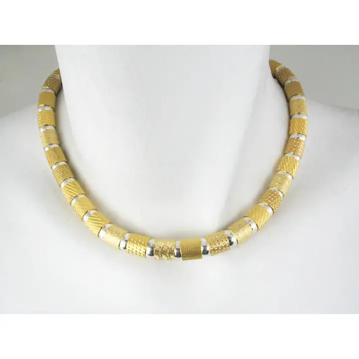 This understated yet refined necklace combines a curated selection of premium materials in an expertly balanced design. The small oval mesh bead pairs beautifully with your choice of silver, 18k gold, or textured brass accents, complemented by coordinating tubes and spheres. Measuring 17 inches with a refined toggle closure, it offers an ideal length for layering or wearing as a standalone statement piece.