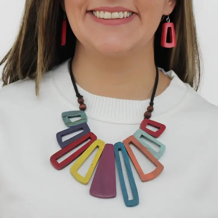 Add a vibrant touch to your neckline with the Boho Bloom Statement Necklace, a stunning fusion of nature-inspired charm and bold bohemian elegance. Crafted from lightweight, eco-friendly wooden beads in a dazzling array of colors and hung on and adjustable black wax cord. This necklace effortlessly enhances any outfit with its playful yet sophisticated appeal, making it the perfect accessory for free spirits and fashion lovers alike. Adjustable Length: 14" - 26"
