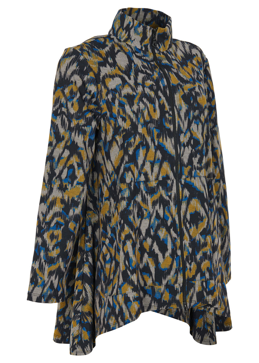 The Jane Jacket features a flared A-line shape with a front zipper, mock neckline, and convenient front pockets, blending practicality with elegance. Its long set-in sleeves and high-low hem complete the refined look, with an ikat pattern in blue and mustard.
