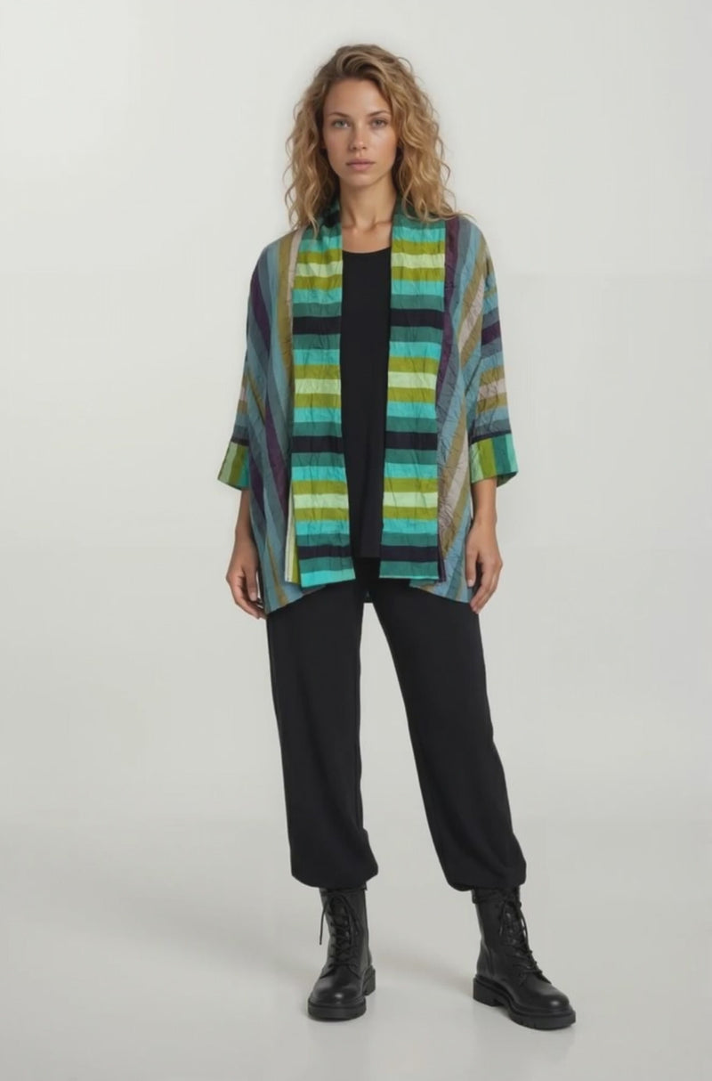 Keep cool in this colorful kimono style jacket with a lapel that can be used as a front tie. Vibrant color stripes on crinkle textured fabric.