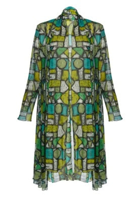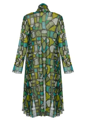 The Molly Cardigan has a free flowing drape that flatters and covers. This sheer mesh cardigan falls to mid shin with a relaxed open front and long sleeves. Triangular insets at the sides lend a graceful sweeping motion to the hemline, and the striking silver lines will complement so many items in your wardrobe.
