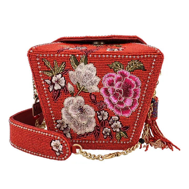 Spice up your style with this takeout-box inspired handbag! Covered in vibrant beads and blooming florals, this purse is the perfect pick when your outfit needs a little extra flavor. Purse Dimensions: 6 x 4.75 x 5", Strap Length: 15"/25", Strap Drop: 5"/10", Features: Removable beaded chain strap with padded shoulder, magnet closure, fits a cell phone