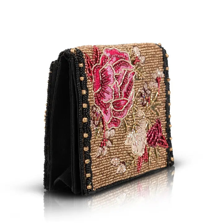 This hand beaded wallet features blooming roses on a rich golden background. Perfect on its own or as the ideal match for our Eastern Bloom Crossbody Bag, it’s a floral duo that’s meant to be seen.