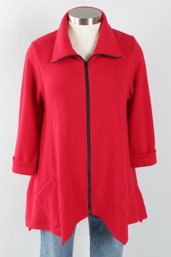 Meet the one, the only—the Fat Hat Sassy Cowl. A fan favorite for good reason, this beauty brings cozy comfort with a high fold-over collar, bold contrasting zip, and angled pockets that mean business. The swingy A-line shape, pointed hem, and clever side slits flatter the figure while keeping things easy and chic. Style it with leggings or a slim pant and let this standout piece do all the talking on brisk days. 100% Cotton. Machine wash cold, lay flat to dry. Made in USA.