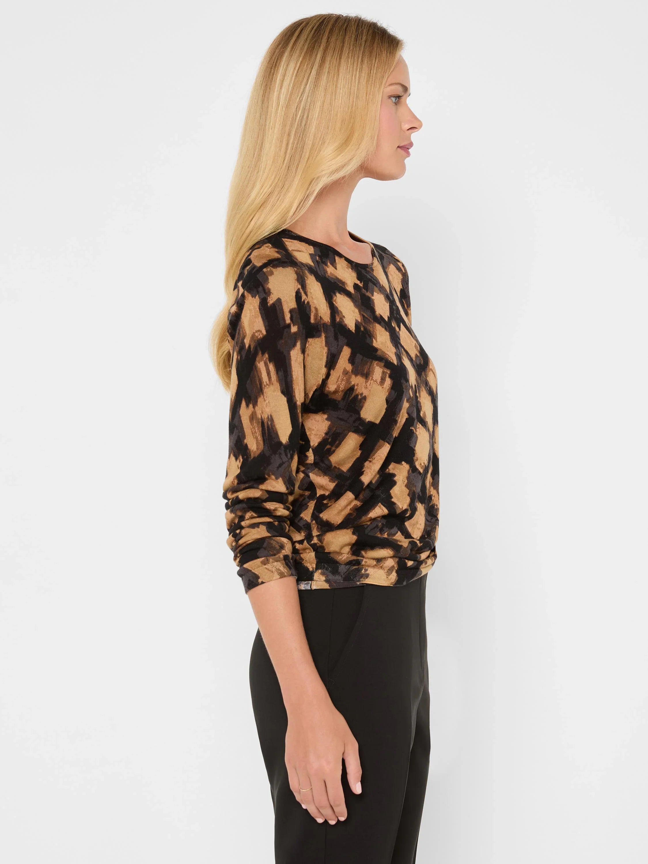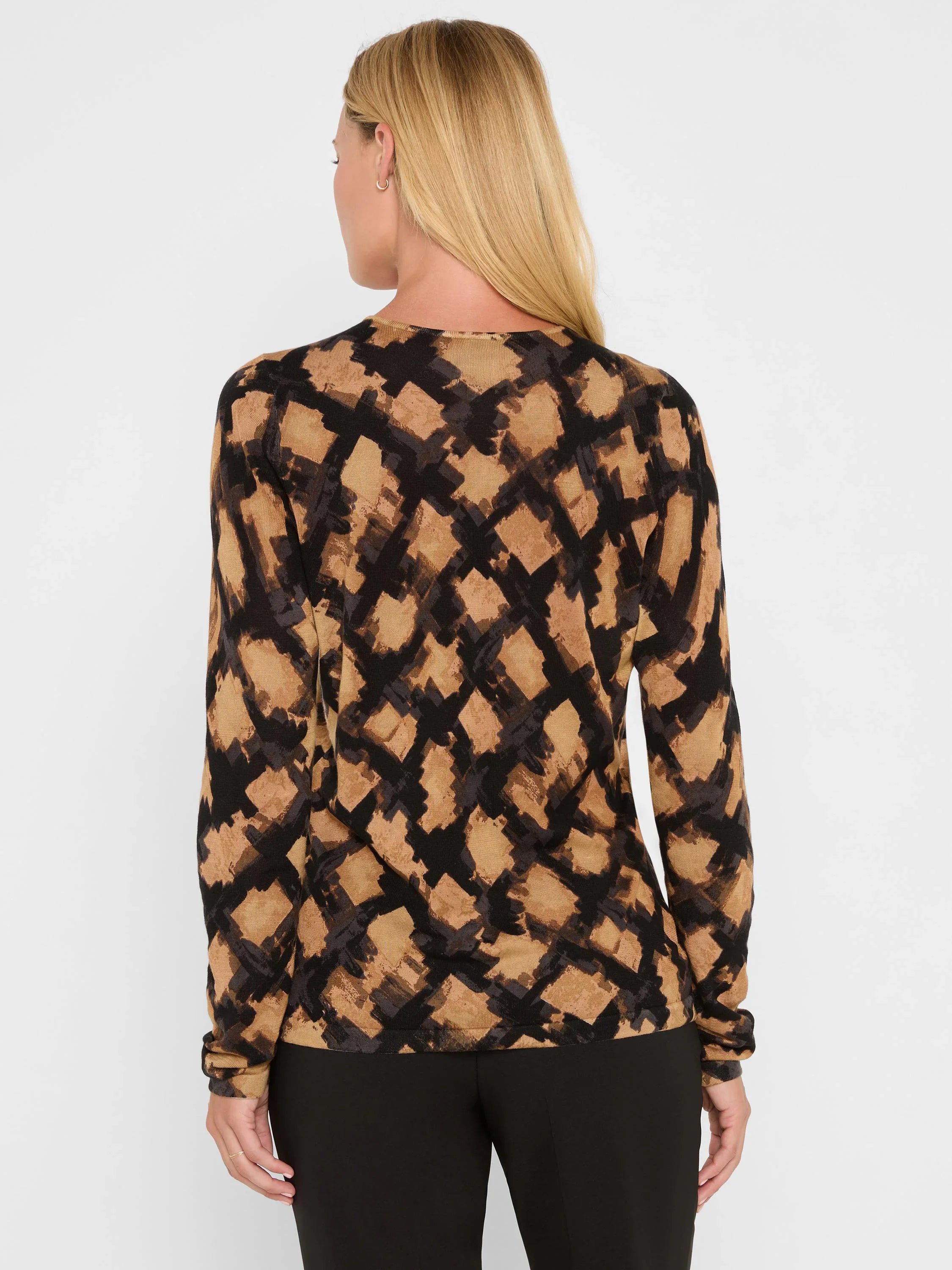 A high-impact print plus an effortless drapey construction makes her the ultimate elevated knit. Pullover and lightweight with a fitted silhouette that stays feminine for a sleek, chic look. The Glowy Check print is sure to make an impression no matter where you wear it, featuring a diamond pattern of dark charcoals and complementary gold tones. Mindfully Made from fully fashioned knitwear that eliminates textile waste.