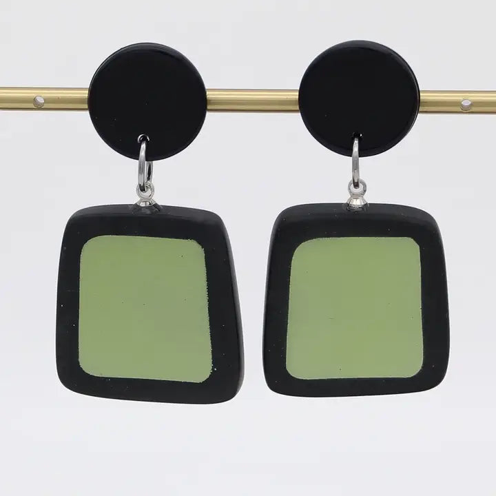 Step up your style game with our Black and Gold Stori Statement Earrings. Made with black resin and accented with hand-painted metallic gold, these artisan crafted dangle earrings are perfect for those who love to be a fashion trendsetter. Elevate any outfit with these knockout earrings. Earrings hang 2" in length and are 1" in diameter