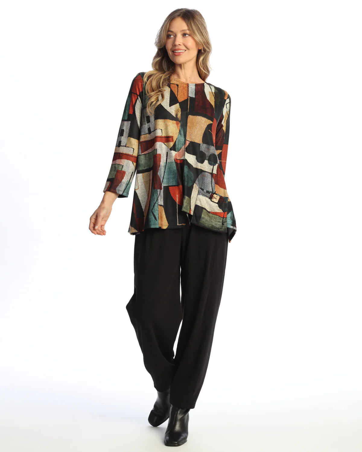 Jess & Jane's super soft French brushed tunic in a multicolor cubism pattern, with round neck, long sleeves and one patch pocket with button accent.