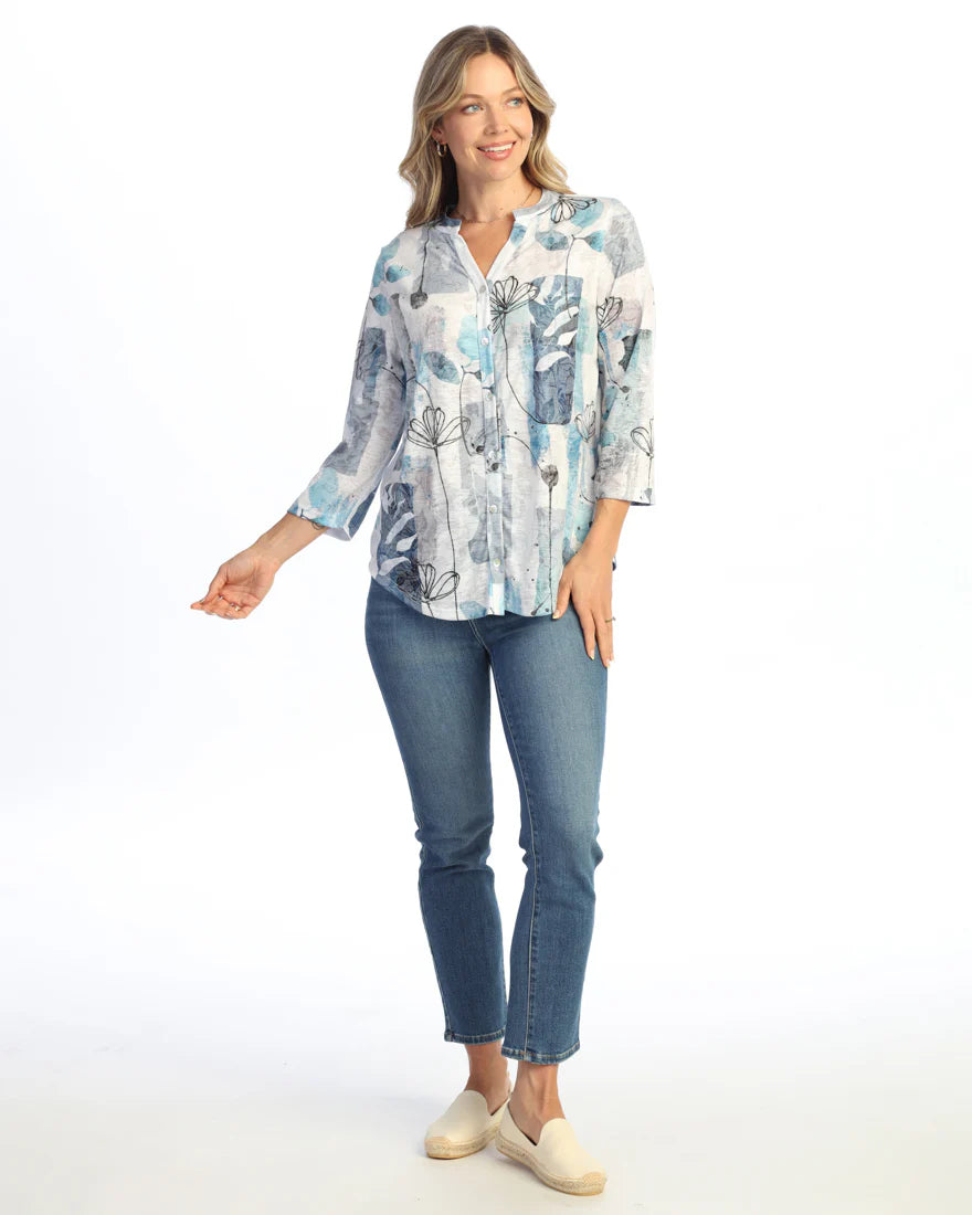 Slip into effortless style with this charming button-down featuring a classic collar and three-quarter cuff sleeves. The vibrant watercolor print brings artistic flair to your everyday wardrobe, while the lightweight fabric keeps you comfortable all day long. Perfect for layering or wearing solo.