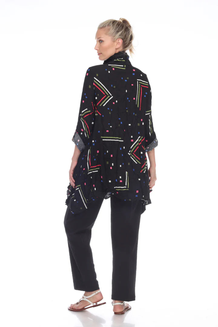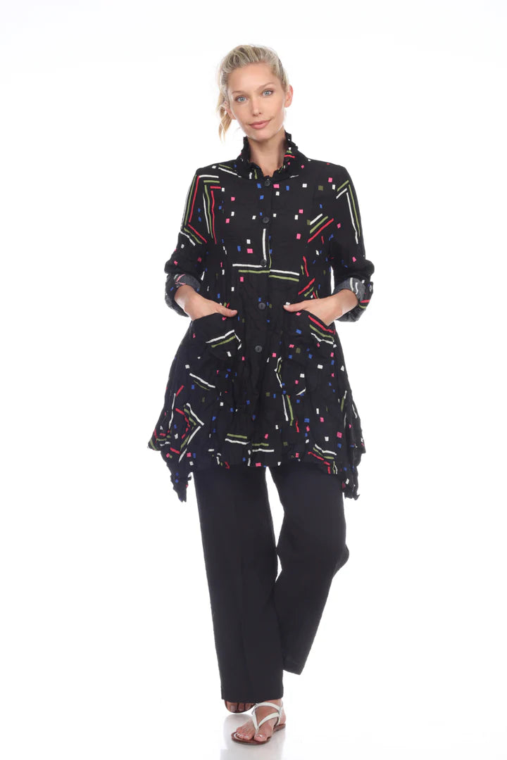 Make a statement with this whimsical jacket featuring an eye-catching abstract print. The button-front closure and wired collar neckline offer classic appeal, while three-quarter sleeves deliver modern comfort and style that's ready for any adventure. Two popckets at front.