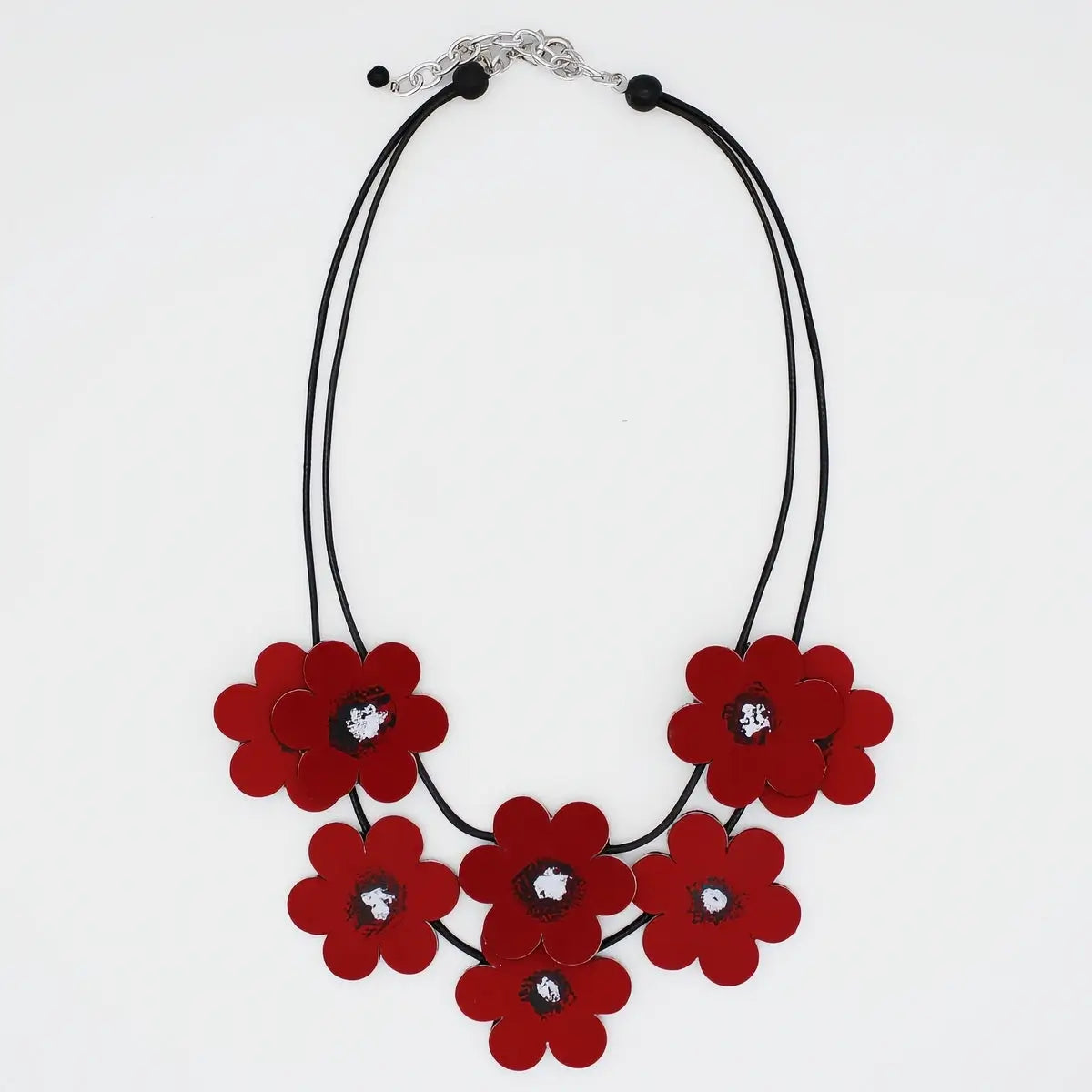 Make a bold impression with this stunning red leather flower statement necklace. Each vibrant scarlet bloom is meticulously handcrafted from premium leather, creating a unique piece that celebrates artisan craftsmanship and natural beauty. Lightweight leather on black wax cord drapes elegantly
